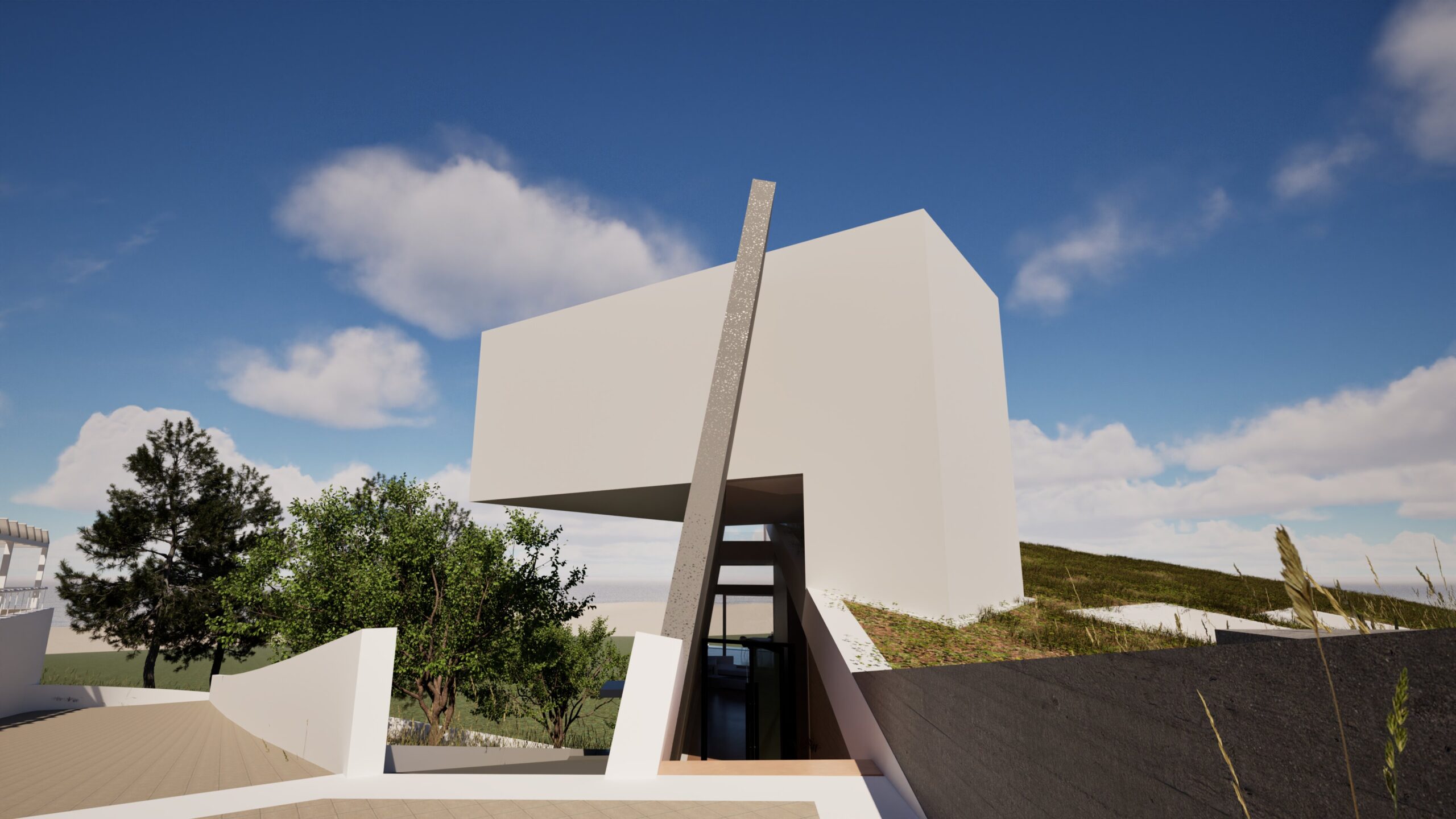 At the lower level, a swimming pool is seamlessly integrated into the design, following the natural contours of the hill. Positioned within one of the carved-out voids, the pool interacts with the surrounding terrain, enhancing the organic feel of the structure. Its reflective water surface mirrors the landscape, further blurring the boundaries between built and natural elements. This feature not only adds to the visual harmony of the house but also provides a tranquil space for relaxation, reinforcing the theme of fluidity and connection with nature.