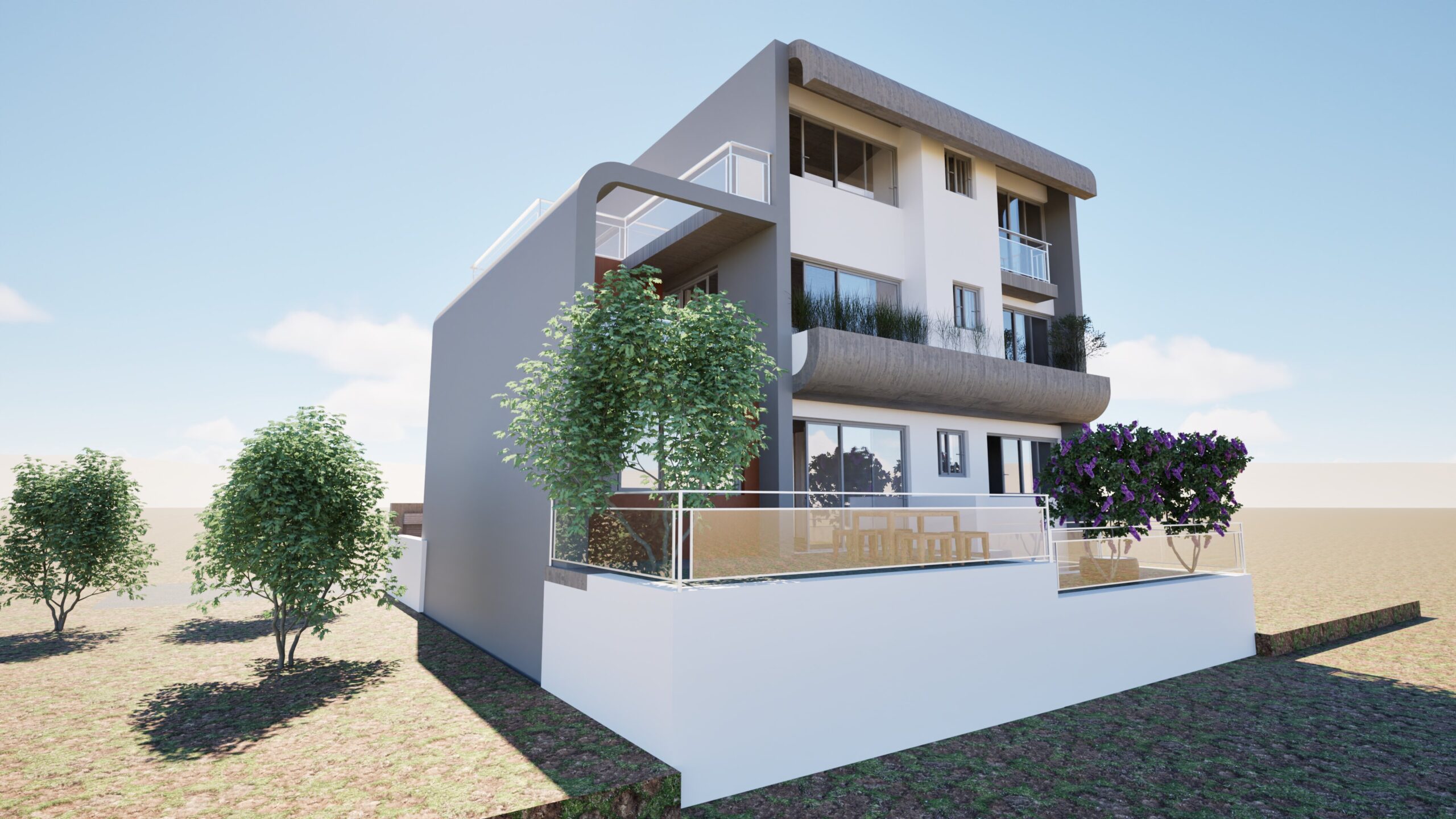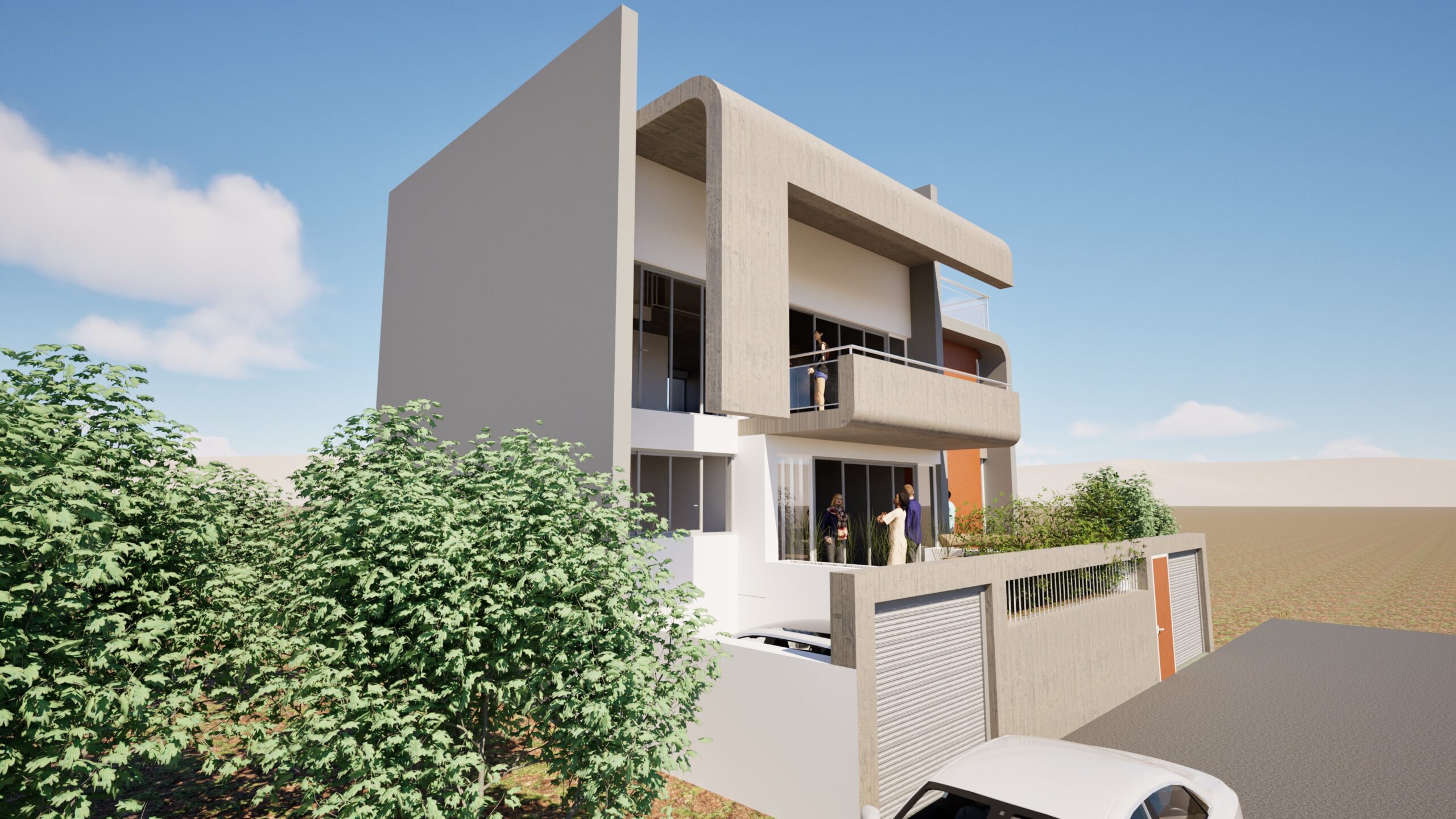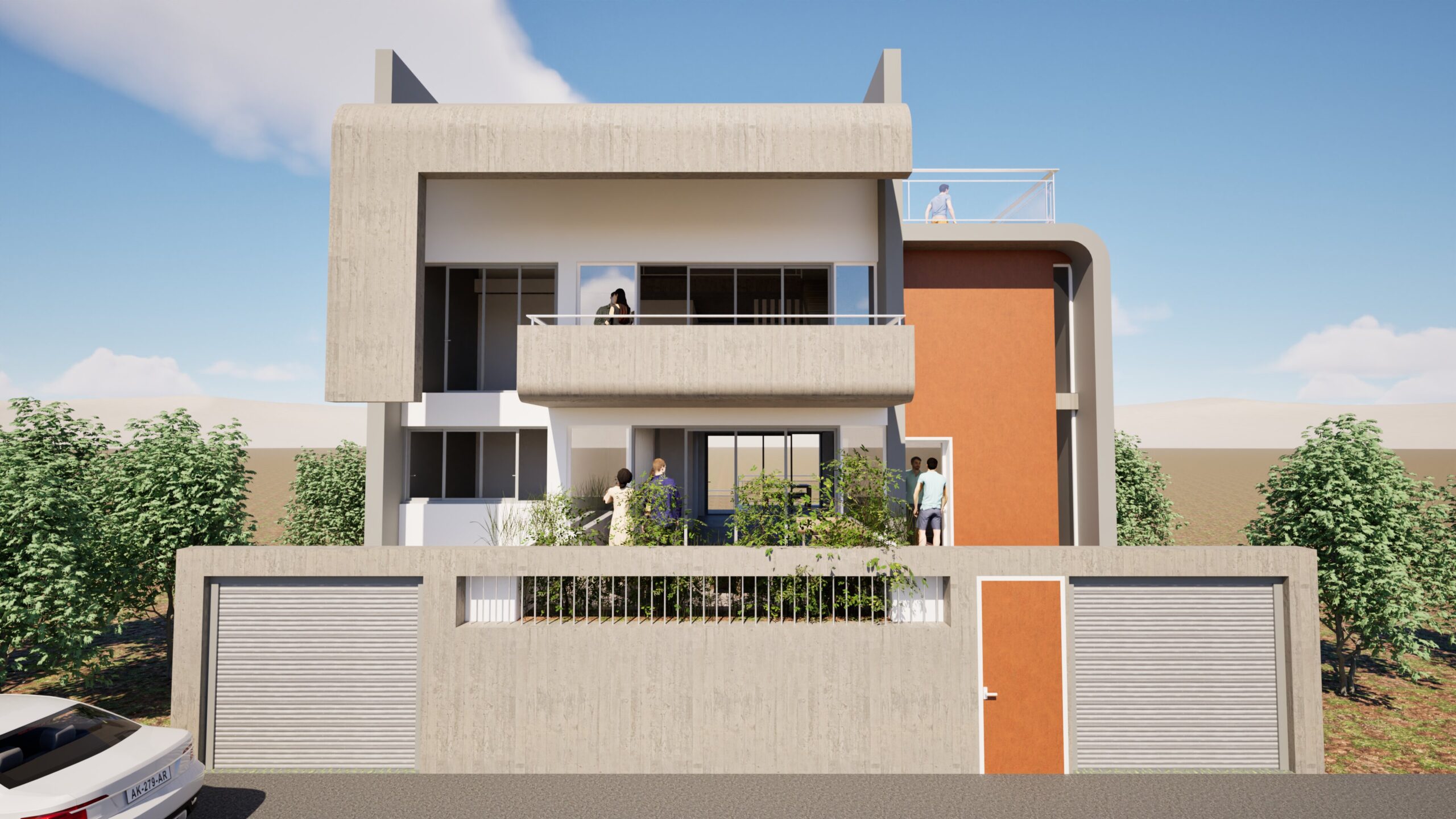 The aesthetic is characterized by a bold use of materials, including exposed concrete and warm-toned terracotta panels, which create a striking textural contrast. A defining feature is the cantilevered concrete ribbon that wraps around the upper floor, providing structural character while acting as a functional shading element for the expansive floor-to-ceiling glass facades. This reflects the firm's holistic approach, which recognizes the deep interconnectedness between planning, design, and construction.